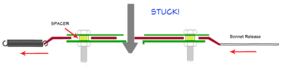 Notice that the spring loaded slider tends to push the latch pin to the left. If the latch pin is adjusted too long, or the bonnet is pushed too far down when closing, then the latch pin head might be pushed excessively down to end up below the short hanging finger of the bottom plate. That is how the latch pin might end up stuck underneath the hanging finger with the bonnet firmly stuck shut.