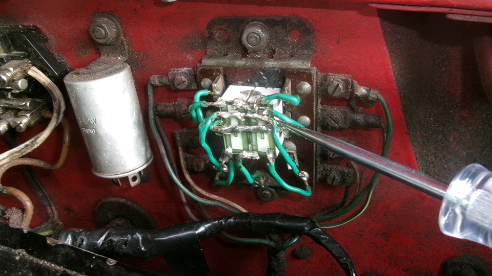 Then another apparently bad decision. I was putting the steel cover back on the relay unit when it sparked momentarily. Huh? Oh, I had left the flashers on, so switch off and be more careful reinstalling the cover. Cover back on, and the switch is off, but it's still flashing. What? Shouldn't flash with no power on it. Pull the cover off to check again. Test light applied to every terminal on the box, the only input power is from the flasher unit, and now the rear lamps are flashing, but not the front ones. Scratching head. With relay in rest condition, the left and right rear lamps are connected together (for brake lights), but no front lamps are connected. That means the flasher output power is somehow connected to one of the rear lamps, and yes the test light does verify this. But this is not a failed relay,so must be a flasher connection terminal wiring problem.