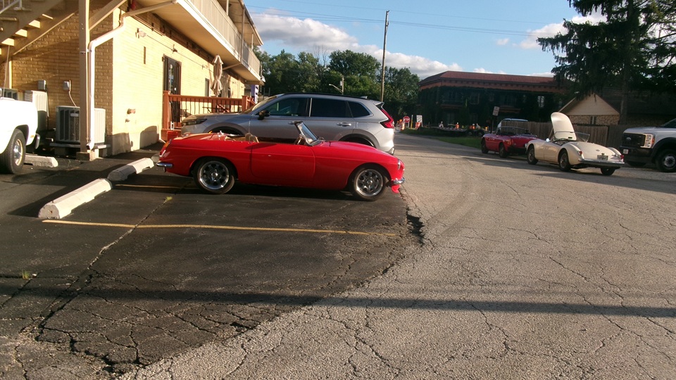 We saw another odd tech question on the MGA forum asking, "Is it possible to replace a generator the a 1962 MGA Mark II without removing the radiator"? Yes it is possible, but it is a knuckle skinner chore involving dropped wrenches and some constructive swearing. So I took time to write a few paragraphs and post a new tech page for Generator Installation. -- Late evening we moved on another 30 miles to Holland, MI for fuel stop, snacks and overnight.