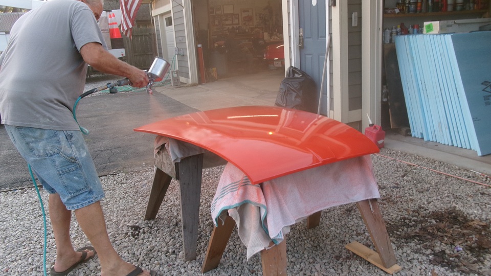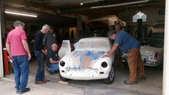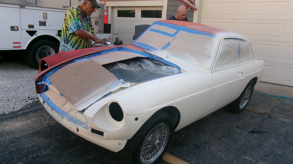 Last spots coverage, finishing an extra coat late evening with a hand held LED lamp, and putting it to bed for the night. This may be wishful thinking, but they would like to finish sand and, 2nd prime, finish sand again, and spray it Orange before (maybe) taking it to the British Car Festival for display on September 7. Check back later.