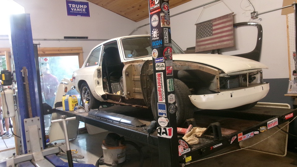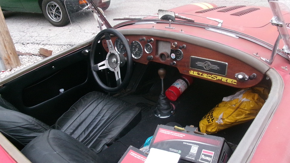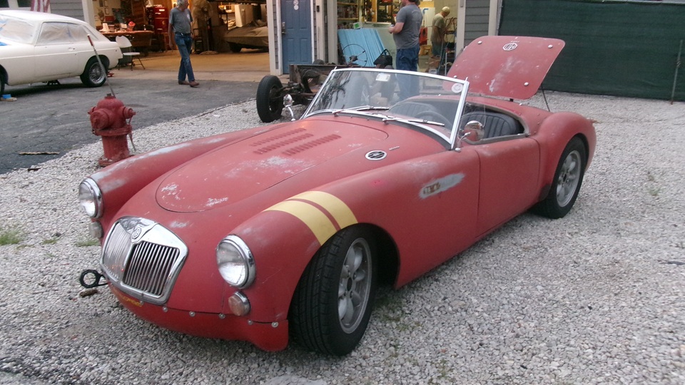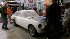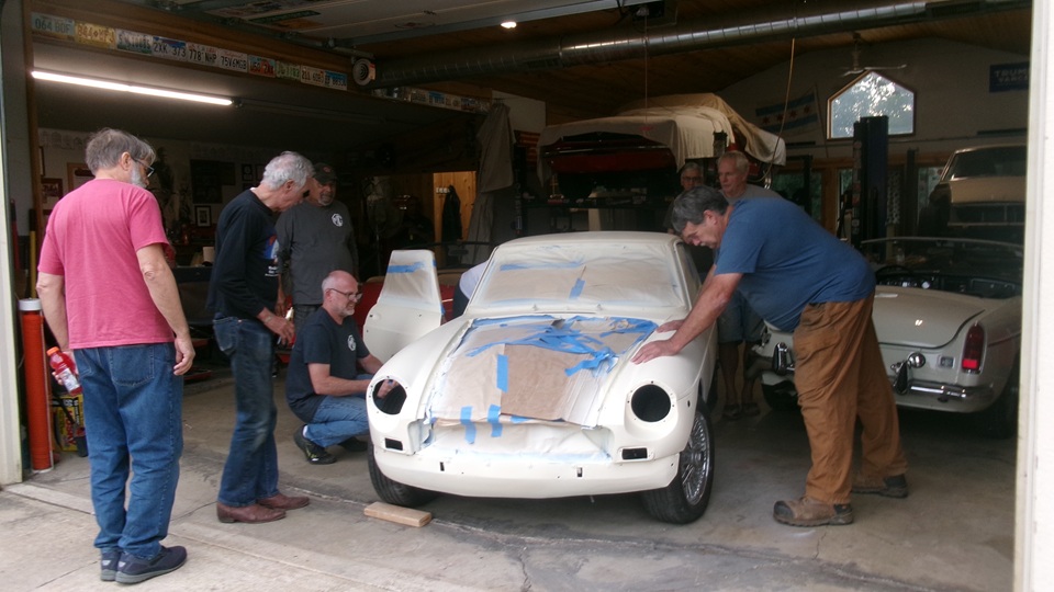 Since we are still hanging around the upper midwest, we drop in on the Wednesday Night Garge Club(again). The white MGB that was totaled out a few weeks ago has been poked and probed by multiple people placing dibs on various parts for recycling into other cars. The CMGC club project car has a little attention since last week, with some blue spot putty.