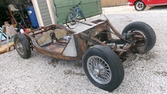 Here is an MGA 1600 with no notable dents, very little rust, lots of patina, a fairly valuable "survivor car". Looks like it may have some racing history early on with front wing side vents, bonnet louvers, racing stripes, alloy wheels, towing eye, fire extinguisher. Plan for this one is to clean it up best as possible and spray it with clear coat to preserve it. Should be an interesting project.