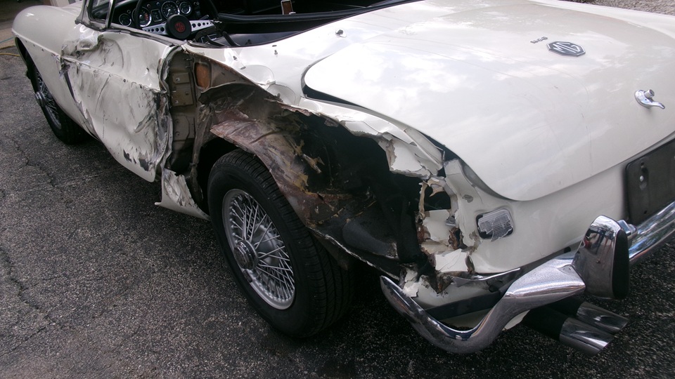 This was very nicely restored MGB. It was on its way to MG2025 car show in Crystal Lake, IL in late July when it was hit by a truck in northern Indiana. Total write-off paid by the insurance company, then sold back to the owner for salvage value (about 10% of book value before the accident). Now going to be disassembled to recycle the good parts, including the good engine and an early 3-synchronizer overdrive gearbox, and all of the chassis parts.