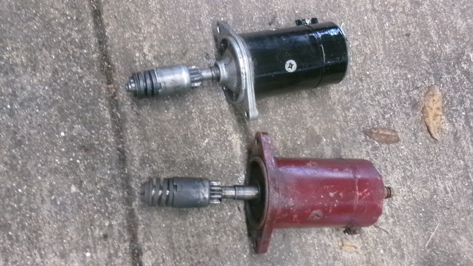 One sad boo for the day, the new pre-engage gear-reduction starter motor didn't fit in the car. the motor housing extended on one side is clocked wrong, so it hits the steel clutch hydraulic pipe, just above where the clutch slave hose bracket is welded on the unibody. Gawd, I feel bad for this guy, after my recent fiasco with the new MGA radiator that didn't fit in the car (and still hasn't been returned). The old (black) inertia starter recently removed has a very badly worn pinion gear (and worn ring gear as well) that is on its last legs and will jam frequently. We groused around in the attic to find another (red) similar inertia starter with a much better pinion gear. We are all wondering if this is the one removed from my MGA when I installed a gear reduction starter several years ago (maybe). Connecting them to a battery jumper box had both jumping to life equally well, so the red one was installed in the car with a prayer and a song, as they are not pulling the power unit again to change the ring gear. With several starts, this one only jammed once, so that should get him by until he can exchange the new incorrect gear reduction starter for the correct model. All said, put the jumper battery box back in the shop and plug it in to recharge.