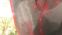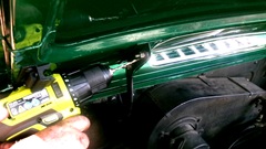 after which they were anxious to get the car out. But I was insisting to drill the alignment holes through the hinge brackets so they won't have to fight this again next time the bonnet needs to be removed. As was, there were holes through the hinges, but no holes in the bonnet brackets. That means this bonnet was a replacement part since the last time it was drilled. The existing holes were 5/32" where I was expecting 1/8". No problem, just grab a 5/32" drill bit from the Magic Trailer, and a power drill with one of the new batteries, and in just a minute there were four new holes all in alignment, ready to pin the bonnet in place next time it needed to be reinstalled.
