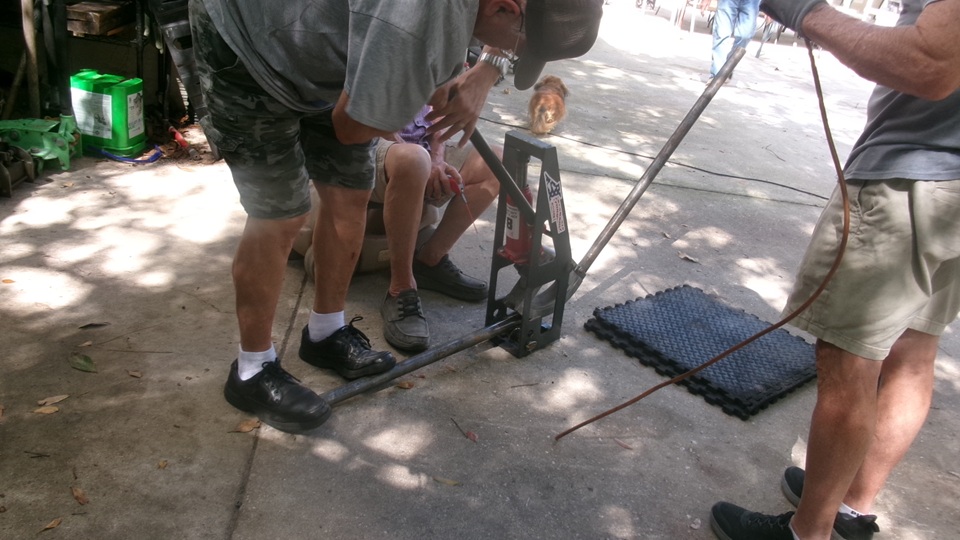 Firing up Tina, the wannabe race car. I think they just like to hear it run once a week. Today they get srtarted on fabricating a roll cage, beginning with two sides of the main hoop. They bought this hydraulic pipe bender, at least two years ago, knowing they would eventully be making a roll cage. I saw them using it once when it was new, but I think theywere only bending exhaust pipe tubing then. Now they are all anxious to see how it does on thick wall tubing, assentially 1-1/2" steel pipe.