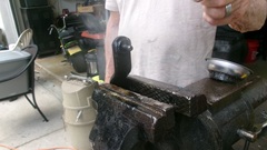 Kind of slow pumping, but seems to work pretty good, as long as there are extra hands to hang onto it, since it is not bolted down. There was a piece of copper tubing they formed byhand for the shape template. Once one came out good, it didn't take long to form thesecond one mto match. A little extra length on both ends, it will be cut to fit in the car before welding. Enough work for the old guys for one day. They will likely get back to it next week.