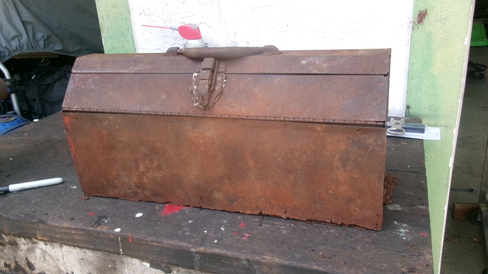 No need to cut the tray down, leave the 1-1/2" overlap, and put two pop rivets in each end to hold it in place. No spot welder handy, so spend some time with the MIG welder stitching in tack welds every 1/2" at the edge of the new metal inside, both sides (not at the ends where they hide inside under the end shelf gussets). Then more tack welds all around the outside to secure the bottom edge of the old metal. Then half an hour with a flap wheel sander in an angle grinder removing sharp burrs from all the tack welds. Some of the original spot welds for one of the hinges had broken loose along with some slightly bent edges at top of the side wall, so more time with clamps and tack welds to re-attach the hinge. Then what must have been two hours with a Scotch-Brite wheel in power drill and the flap wheel sander, buffing off all of the old paint and rust inside and out (should have been a sand blasting job). After digging ourselves out from under a ton of grinding and sanding dust, blow away remaining dust and wash the box down with lacquer thinner, like clean enough to paint (but not yet). It was looking pretty good, so time for pictures.
