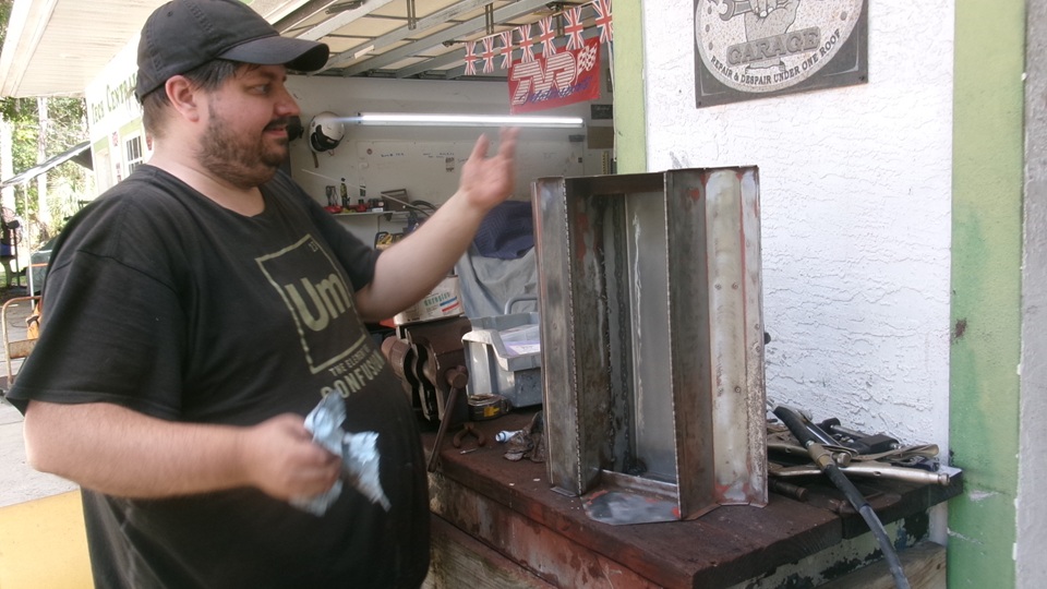 For the first time in my life, I was going to try "angel hair Bondo" (short strand fiberglass reinforced filler) to smooth over tack welds and corner gaps, and fill in a few welding blow holes. The two pound can of filler we found in the paint booth was half used and somewhat dried out, hard to get out of the can, hard to mix and hard to spread. Given what we had in hand, we made do as best we could, and an hour later it was time to give it up for loss of daylight. Clean up our mess ,and ourselves, pack up and head off for late lunch and WiFi.