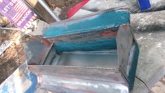 Off to Tech Central again with a bit of a mission (or hobby). We will try to repair (rebuild) a 50 year old steel hip roof tool box. We are rather fond of this box, because of its thin walls and space efficiency (and limited space in the Magic Trailer). You can't buy a replacement like this any more. The problem is, the trailer is often wet inside,so the toolbox has been rusting badly. We have not been able to pick it up for three years, as there is no bottom left in it. After inspection, the first move was to cut one inch from the bottom of the side walls all the way around. And lots of penetrating oil on the lid piano hinges.