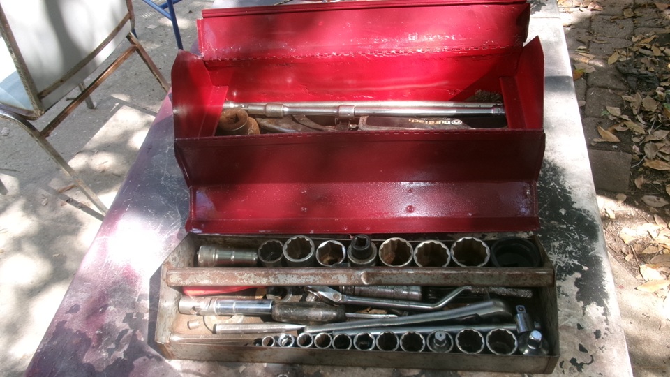 Finally it has plastic feet, so it does not have to sit on the damp floor in the Magic Trailer. The center picture below illustrates the space efficiency advantage of the thin wall sheet metal box, with interior space nearly equal to the overall space it occupies for traveling. Then we begin to load it up, beginning couple of drill index, a manual impact driver, and the 1/2" drive socket set I have had since 1968, and a few more oversize sockets. The 19" long box easily holds 18" long big-boy tools. The lift-out tray gives quick access to the stuff underneath.