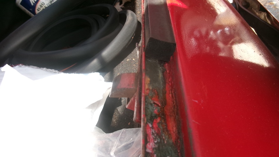 Now we spend a few more minutes replacing the weather seal for the MGA boot lid (again). Pull out the fat rectangular foam rubber strip that would not allow the lid to close. Install this hollow rubber strip that will compress easier to allow the lid to close with a moderate push. The 3M weather strip adhesive was very sticky stuff, too easy to get stuck on fingers (and paint), too hard to remove, but it does wonders for holding the rubber strip in place.