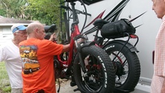 One last Friday visit to Tech Central, looks like not much planned for the day, but there was a little chore to mount two fat-tire e-bikes onto an older rack on back of the motor home. After deleting some base adapters the fat tires fit into the rack okay, but the top clamps would not come down far enough to hold the frames. Solution was a quick trip to a local store to buy two high bars that clamp between the seat base and fork bearing tube, after which the top clamps on the carrier work fine.