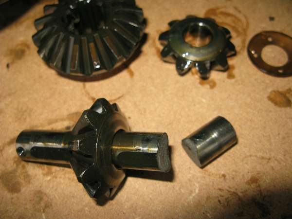Broken differential pinion shaft. A few of these have been reported. This may to be a result of a loose locking pin, possibly left loose after changing the thrust washers. When the pinion shaft slides out one side of the carrier it can hit the input hypoid input pinion gear. (Photos from K.Garner, West Midlands, UK)