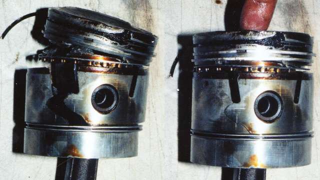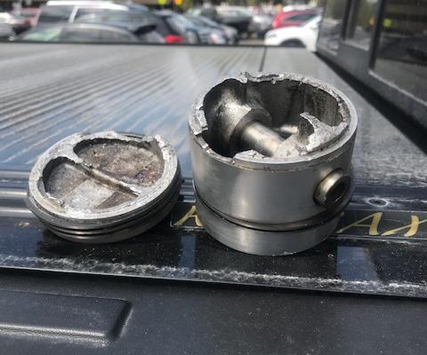 Here's another one. I've had a few of these, always fun when it happens, quick to diagnose, and various cost to repair depending on collateral damage. My Aerolite 4-ring pistons seem to have a habit of breaking at the 2nd ring groove. This one is a 5-rin piston, identity yet unknown.