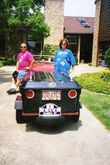 June 2 early am. Barney and Carol hanging out at Merryweather Manor in Lucas, TX, home of George Merryweather. Picked up the rally placards here, nice touch. Waiting for the Morgan from Dallas.