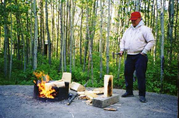 June 9 pm. Big logs, little hatchet. Barney tending fire at Fort St. John, BC.