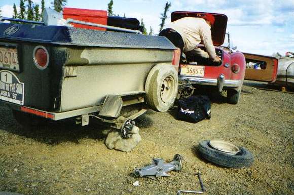 Just three miles farther and the trailer gets another blow out on the other side. This time the tire is cut through the center of the tread. We have another new tire, but it's not on a wheel, and we loaned the air pump to Bob, so now what? 18 miles down and 407 still to go (one way), then return.