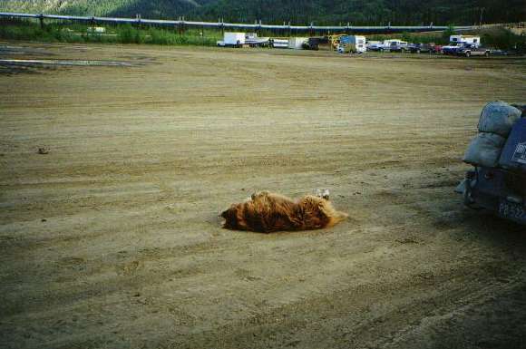 No, the Morgan didn't hit the dog, he's just enjoying a roll in the dust. The MGA left the trailer at the side of the road and drove another 36 miles up to the Yukon river crossing for tire service. By this time the Morgan +4 had gone to the Arctic Circle, decided against the rest of the road, and was returning. At least we got the air pump back. And yes, that is the pipeline in the background.