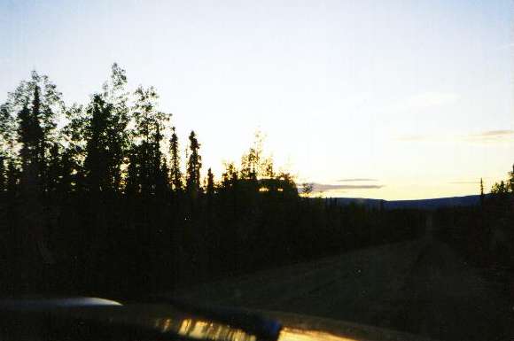 June 17, really late night. Heading north on the haul road approaching midnight with the sun directly ahead on the horizon. Cresting a hill is nearly impossible when neither visors nor sun glasses will help. Stop, check out the side to see if we're still in the road, creep forward a bit, check out the side again.
