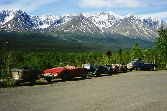 June 15 am. Cars at visitor center, Haines Junction, YT Kluane Mountains in the background.