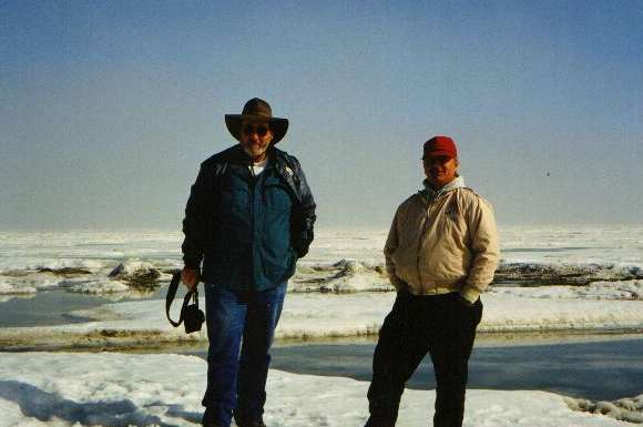 June 19 - Dick Criswell and Barney Gaylord at the Arctic Ocean. As this is private land owned by the oil companies, and they have safety and security concerns, the way to get here is via commercial tour. $20 buys you a one hour tour in a crew cab pickup truck, with brief explanations of the oil field operations, local wildlife, weather, water, ice, 24 hour days, 24 hour nights, and whatever else you may like to ask about. $50 pays for a four hour tour of the oil fields. $$$$ buys you a two day tour of the arctic ocean by land and air.