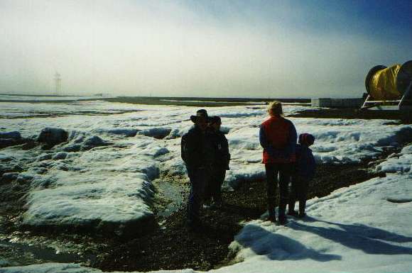 From the Arctic Ocean looking back south towards Deadhorse. This was about 11 am with the sun just off to the left about 27 degrees above the horizon. The last of the fog was just burning off, and the temperature was about 45dF. In mid afternoon the temps were up to about 55dF. |