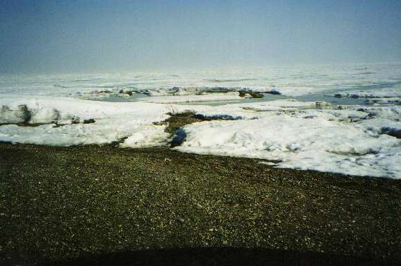 Yep, that's about it, a few square yards of gravel and a little open water between the ice flows. By the summer solstice the ice should have been long gone, but there was a late spring, so we got this special treat. Things were melting fast though. Two more weeks should yield all open water and no more ice. |