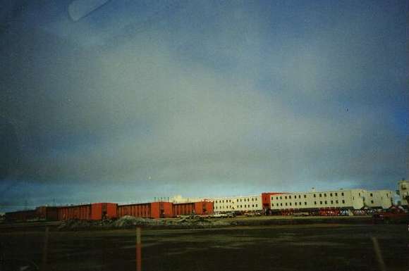 Typical residence halls at Prudhoe Bay. These prefab units are built on pilings (stilts) to prevent melting of the permafrost when they are installed as stationary buildings. The ones shown here (in storage) are mobile, either on wheels of on skids, so they can be relocated in the oil fields as the drilling sites change. |