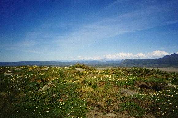 Before getting back to the tree line we were traveling through high dessert country. Here they get less than 8" of rainfall each year, and the tundra is hanging onto life above the permafrost by the mearest threads.