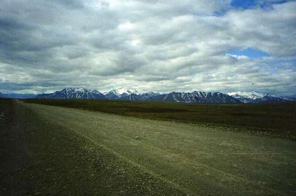 The Brooks Range, looking east at mid-morning. Mountains are nice anywhere, but this was an especially pleasing sight after many miles of high desert. And they are postcard gorgeous here.