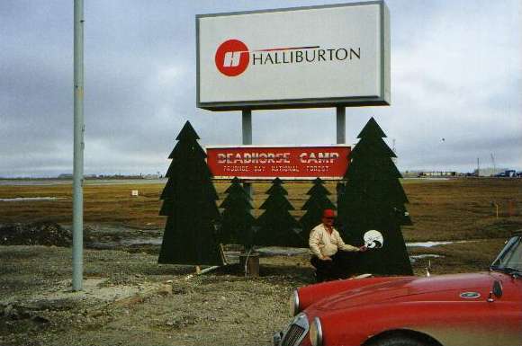 June 18, 2:00 pm. Ahhh, finally! The haul road ends at Deadhorse, three miles short of the Arctic Ocean. Here you find the prominent local landmark, the Prudhoe Bay National Forest, and you're looking at it (all of it). The plywood trees are the only ones you will see 300 miles north of the arctic circle. And the mother and cub Polar bears on the sign are also about the closest you will get to reality, as Polar bears spend most of their life on ice flows at sea. |