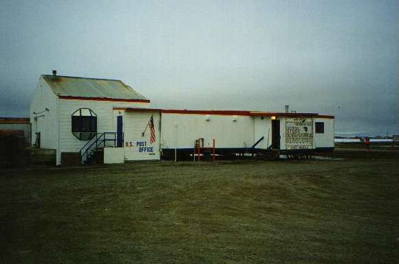 Post Office and general store at Deadhorse. More than the sum of its parts, this place looks more like a WallMart inside. Other stores of interest to the visitor might be the NAPA Auto Parts, the Chevron full service gas station, or the Tessaro do-it-yourself credit card fuel pump. The only restaurants in town are in the hotels, and no grocery store anywhere. That part seemed a little strange, considering we were 500 miles from Fairbanks. But then there doesn't seem to be any private home in town either, just lots of hotels. |