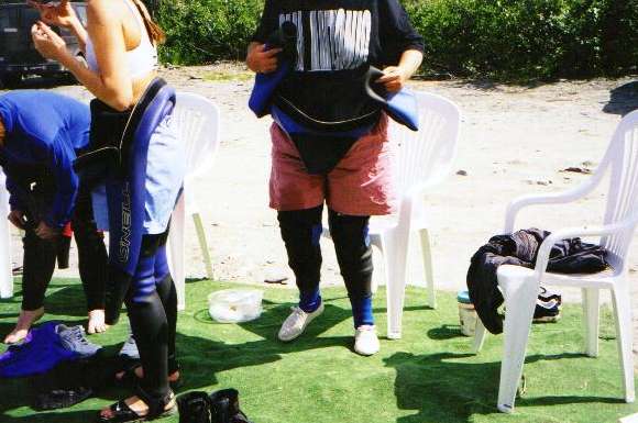 June 24 - Time for a little white water rafting on Six Mile Creek with the Nova Adventure Company. Since the river water is Glacier melt at about freezing temperature, we all push and pull and shove ourselves into dry suits for the trip down the river. Then there's always those ragged shorts to protect the dry suit. What a mottley crew! Carol is already having second thoughts about this. |