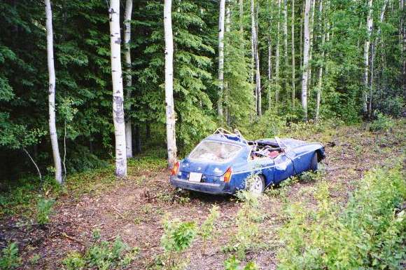 June 20, 5:20 pm - 90 miles out of Fairbanks on the George Parks Highway was the low point of the trip. We were plodding along the only smooth paved highway in the state at about 60 mph with the MGB GT following about 1/2 mile behind the MGA. After a couple of turns in the road, the GT just wasn't there in the rear view mirror any more. After waiting in the road for a few minutes we turned back to investigate. We missed seeing the car on the first pass, as it was some distance off the road and below our line of sight.