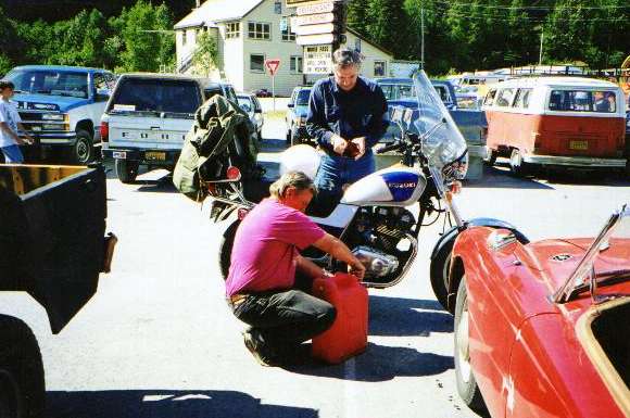 A little fuel for a friend in need at Moose Pass. About halfway between Anchorage and Seward, and 30 miles from the nearest gas station. And no, we didn't take his money.