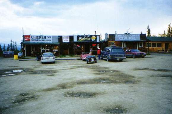 July 5 - The town of Chicken (population 37) on the Taylor Highway north of Tok. Most of the town is in this picture. The Chicken Mercantile Emporium is on the left. Next in line is Chicken Liquor Store, where it is illegal to consume alcoholic beverages on the premisis. Next door (with a pass through door from the liquer store) is the Chicken Creek Saloon. The Chicken Creek Cafe is a nice 50's style place with plain wood everything, plaid table clothes, juke box, and home made pie. The newcomer to the strip mall is the Salmon bake, just opened and still without a sign. Just out of view to the right was a small horse and a mule, common transportation to the mall. |