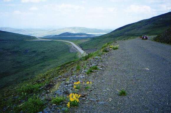 We found this older section of Top of the World Highway just a few miles back into Yukon Territory. Here the MGA exercises its attitude to negotiate a first gear only hill and a few serious washouts in the road to achieve a little extra altitude. We pause to look down on the newer section of the road that takes the easier way through the valley, but at the loss of this beutiful view. |