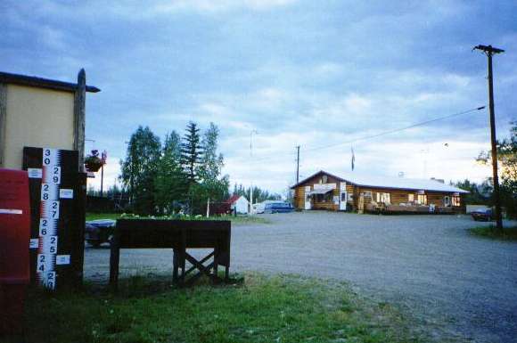 High water marker and Yukon Trading Post at Circle. The town has been flooded more times that you care to count. They finally seem to be getting the idea that they should rebuild on high ground.