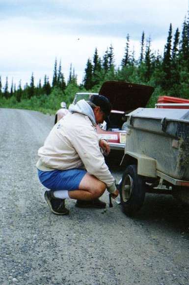 July 7, 9:00 pm - Another flat tire tire on the trailer. Well, not too bad. The only other tire problems we had were on the haul road nearly a month earlier. But this set of trailer tires was completely bald after only 4000 miles of Alaska roads (mostly gravel). We were planning on a new set at Whitehorse, but then decided to cruise the Campbell Highway on the way back and bypassed Whitehorse completely. We did finally get the fourth set of tires for the trailer the next morning in Watson Lake (back near the Signpost Forest).