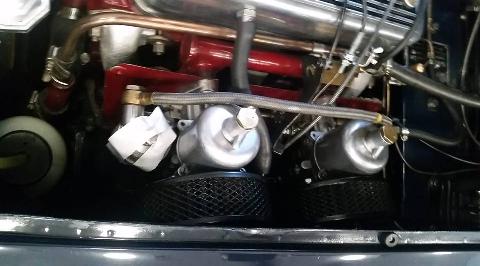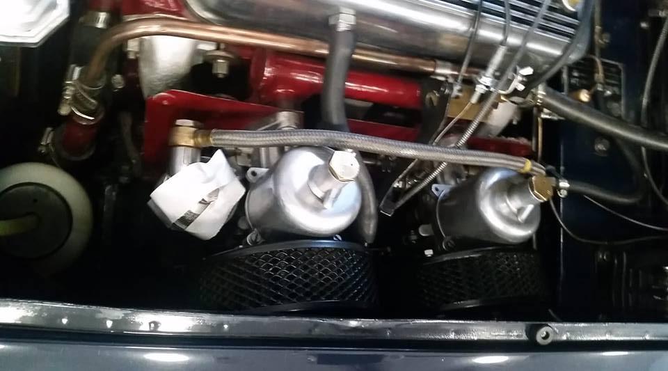 Overflow tube missing from front carb fuel bowl at Dillard car show.