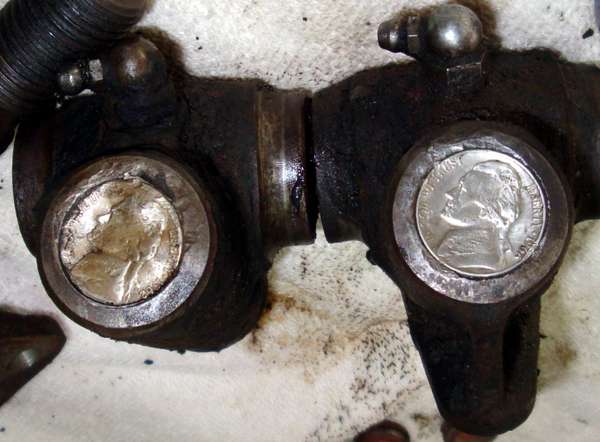 If you think a Welch plug ain't worth a plug nickle, you might find another application for the nickle. Someone took this shortcut for plugging the ends of suspension swivel links. Photo upplied by Christopher Wilson in North Carolina.