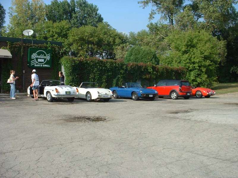 After Kaneville we take a the last few side roads available en-route to the blackberry Inn to close out the rally and celebrate a bit. The Jag XK-140 had taken his leave a couple hours earlier from Hinkley, as he had a late afternoon appointment in Chicago, so we don't have their feedback. Six of the seven other Little British Cars (including rallymaster in the MGA) are finished by a quarter-to-five, well within the non-penalty five hour time limit. The TR6 finally arrived about 5:40, slightly more than a half hour past the deadline for the maximum 20 point penalty,but even with the penalty they were not the last place team. One car just slipped over the 100 mile limit for a 4 point distance penalty, while five other cars kept their distance on the slim side of 100. The fastest car in the rally was a real screamer, flying along with average speed of 26.3 mph for 3-1/4 hours, finishing nearly a full hour before the second arrival (and 1-1/2 hours before the rallymaster).