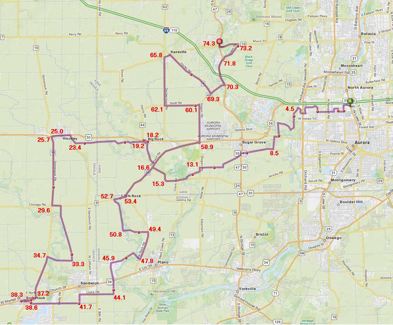 After a bit of zig-zagging we pass through Little Rock in one minute flat, true to its name, then heading north-east on Granart Road toward Aurora Municipal Airport (actually passing through a bit of Sugar Grove again).