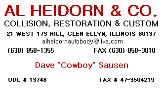 This is the outfit that painted our CMGC club project car in September 2007 (after club members did the body work, priming and wet sanding). Dave Sausen is the one who actually paintede this car. Al Heidorn is deceased (~2013). The shop is now ownwd adn run by Dave Sausen.