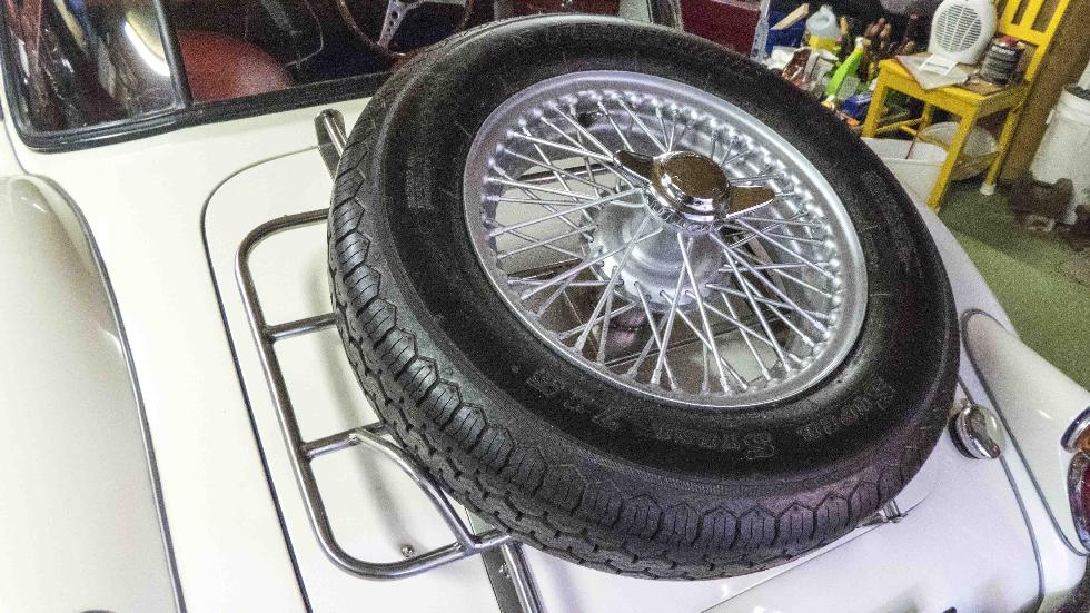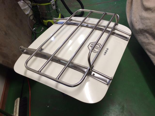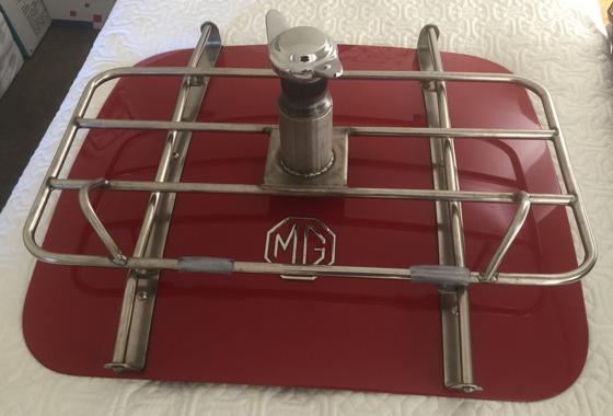 "From memory it cost me $250 for second hand boot (no rust with latch) that had a slight crease in the skin plus had holes drilled in the wrong place from a previous rack (a mate welded up for nothing), another $750 to have it panel beaten and painted with 2 pack to match car, $500 for Moss ss rack, $200 for a guy to fabricate spear assembly (I provided the stub and spinner for nicks as they were rejects from another car that was being restored in the Club - a little wear on the splines/thread but fine for this purpose), plus a new MG badge. The only issue after a 10,000 km trip was it chipped a bit of paint off the bottom of the tonneau panel as it moved a bit on rough windy roads in the wilds of Scotland".