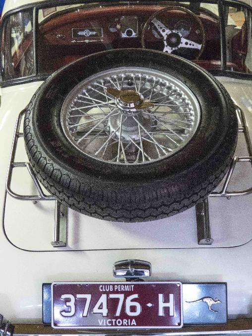 "This is another version of a spare wheel carrier that uses the Moss stainless steel boot rack that a local guy has modified. So far it has had a 500 km run and no problems. Boot lid is heavy to open as you would expect but easily manageable. Boot lid doesn't twist at all in the raised position. The back bar of the standard frame was removed and the corner bends used as the angle supports for the tire in the wheel carrying version. A few of the Aussie guys are going for the external spare wheel mount for our 5,000 kms European and UK trip later this year to accommodate the navigators' luggage requirements"!
