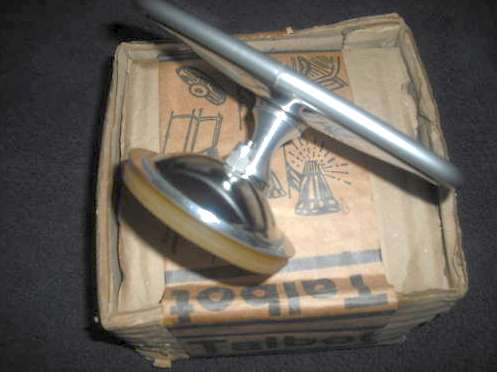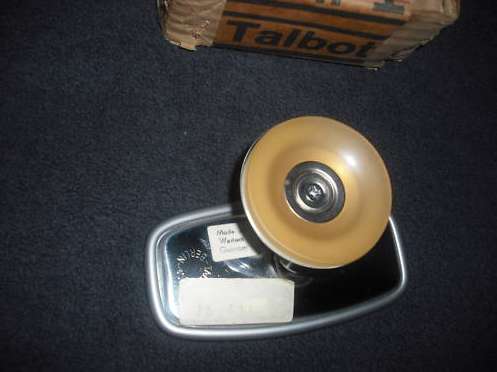 Talbot mirror part# J5 11F. Made in "Western Germany" (when it was still split) by Talbot Berlin Co. Finish is chrome with gray piping around the outer edge, 5" wide X 2.5" high.