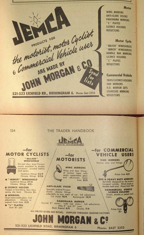 "My complete run of annual UK motor trade listings (“Trader Handbook – for the motor, motor cycle and cycle trades”) from 1945 to the 1970s suggests that the JEMCA brand only existed during the 1950s (ignoring the modern repro brand), with no mention before that and no mention beyond 1958. I’ve attached a couple of adverts from the 1951 and 1955 editions. These handbooks show that during the 1951-8 period, JEMCA was a proprietary name belonging to John Morgan & Co.Ltd. of 521/523 Lichfield Road, Birmingham 6 (Tel. East 2353)".