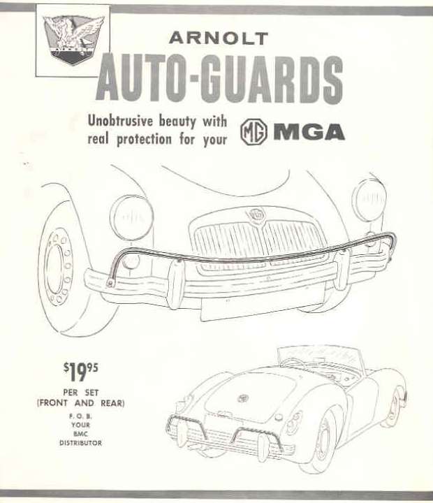 Thanks to quick spotting by David Walter in Bloomington, Indiana, we have this period sales brochure, listed on eBay in September 2009. The parts were manufactered by S.H. Arnolt, Inc. in Warsaw, IN. The brochure was produced by Arnolt MG Accessories, Chicago, Illinois.
